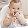 - OMEF Mosoly: A forma elősegítheti az állkapocs stabilizálódását és erősítését, a textúra a szájon belüli érzékelését segíti, illetve az eszköz az ajkak széles nyitását, beszédet (e, s, z, v hangok) gyakoroltatja. Márthatod sűrű pürébe/kencébe (a forma megtartja), vagy önmagában is használhatja a baba rágcsálásra.